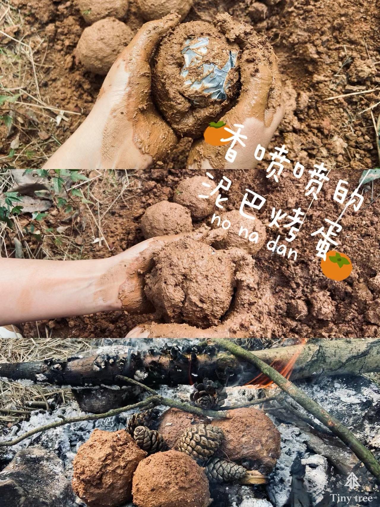 小朋友们一起挖泥巴、和泥巴,一起把鸡蛋裹上厚厚的泥巴,裹上泥巴的鸡蛋就像一颗“手榴弹”一样。