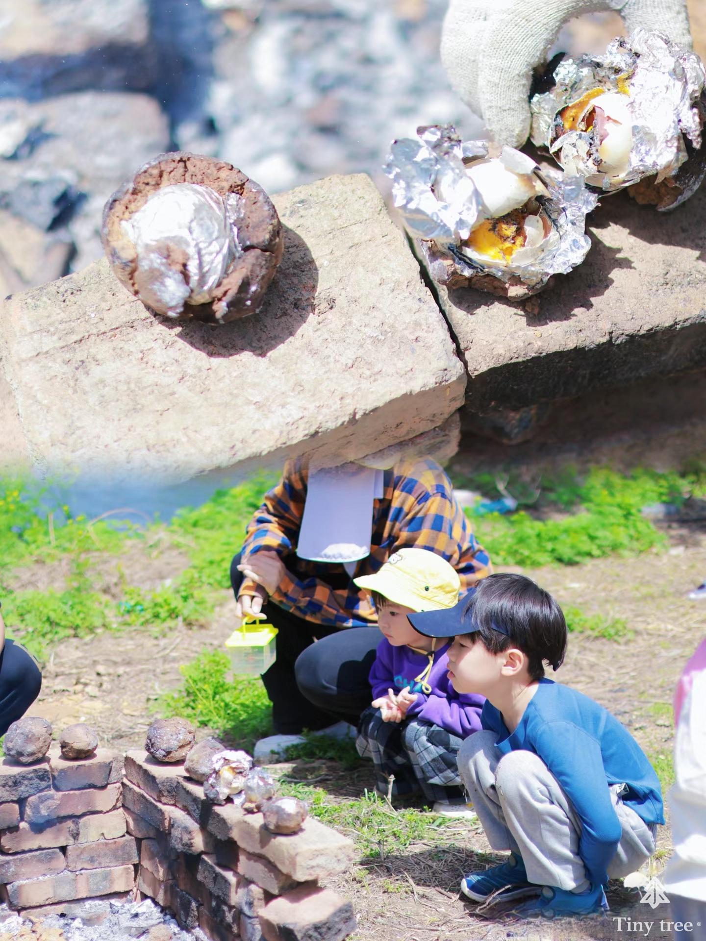 把泥巴鸡蛋放在点着的灶台里,登上20分钟,就能来检查成果啦,扒开碳灰,有的鸡蛋已经爆开了,原来这就是泥巴炸弹啊,但是这样烤出来的鸡蛋真的特别香,孩子们吃得津津有味。