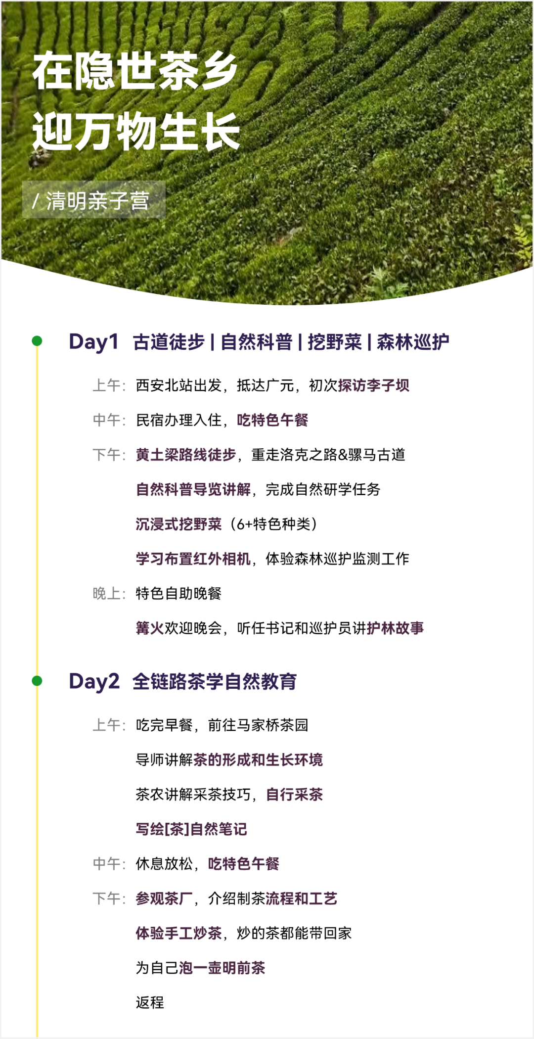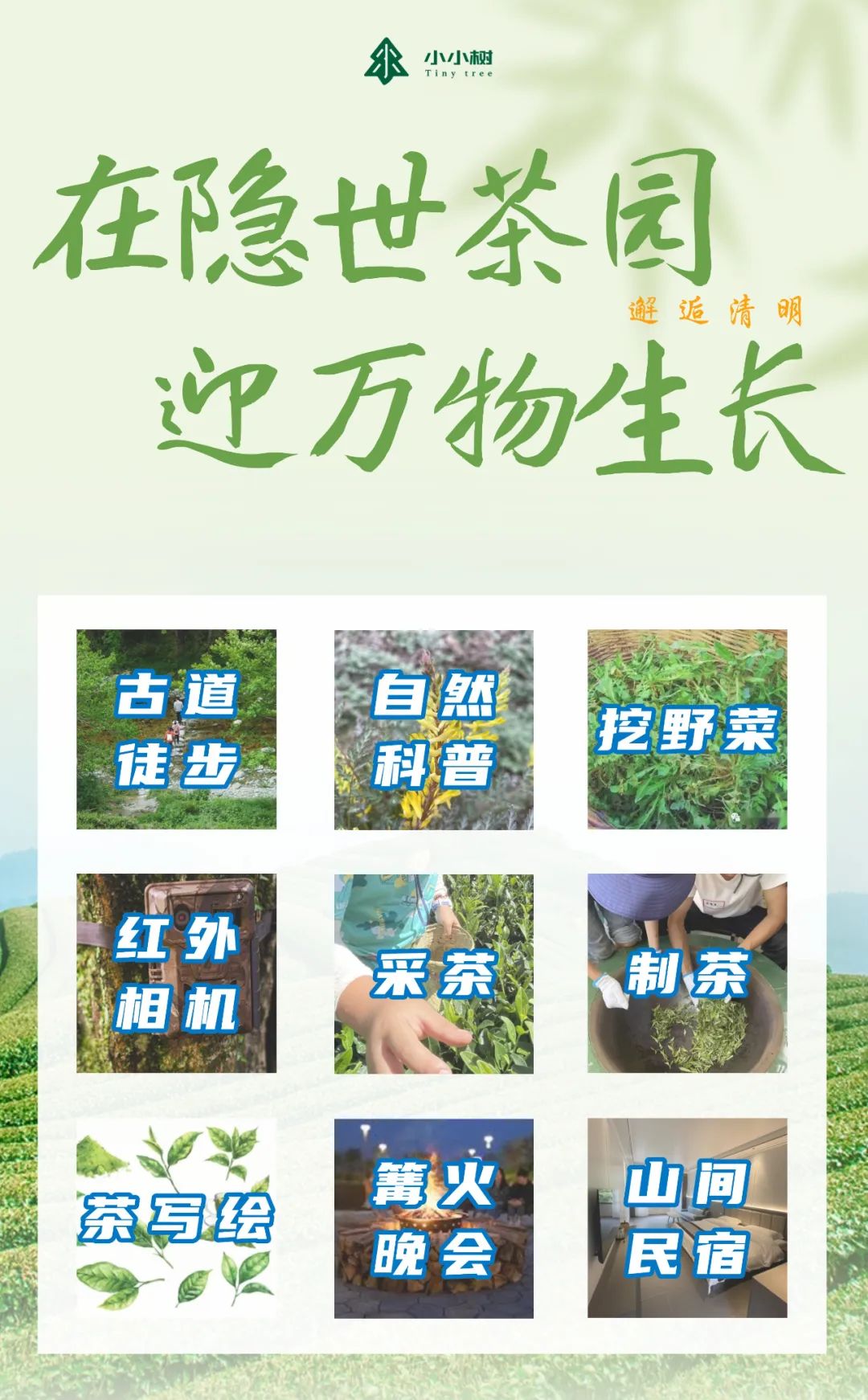 『 写在前面 』 依稀记得,往年的清明出行,总是人满为患、景点排长龙。于是,好想好想在节假日的时候、远离喧闹的城市,找到一个人烟罕至的地方,感悟春天、彻底放空… 3月中旬我们三个中女沾染一路的油菜花香,跨越层层腹地,来到了李子坝村。当我们看到满山新绿的茶园、郁郁葱葱的原始森林,青石板路旁潺潺的水流、绽放着生命力的植被野花,周身萦绕着的一口口春天的气息…我们不约而同地想,“我要立刻退休,在这里待到老。” 隐世茶乡+【原始森林融合茶园】古道+自然生态保护区+沉浸式全链路茶文化体验,我们以最大的诚意,推荐大家用两天一夜解锁全新的、身心放松的体验。 我们将深入到一个世外“茶”源中,徒步穿越原始森林+层层茶园路线,体验“山暮烟重重,路隐林深深”。 我们也将行走在茶山的时光,感受茶树与绿草、野花、野菜共生的自然美景,学习布设红外相机体验护林生活。 我们还会深度融入到真实茶农的生活中,用指尖轻轻掐下茶叶嫩芽,学习体验传统绿茶的采摘、制作、冲泡等一系列流程。直至最后,一杯明前茶入口,装下半个烟火世间。。。 |