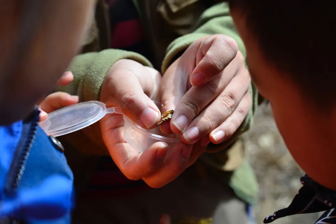 孩子拿着领取的任务卡,在路上仔细观察,找到目标昆虫后召唤上林老师确认、讲解
