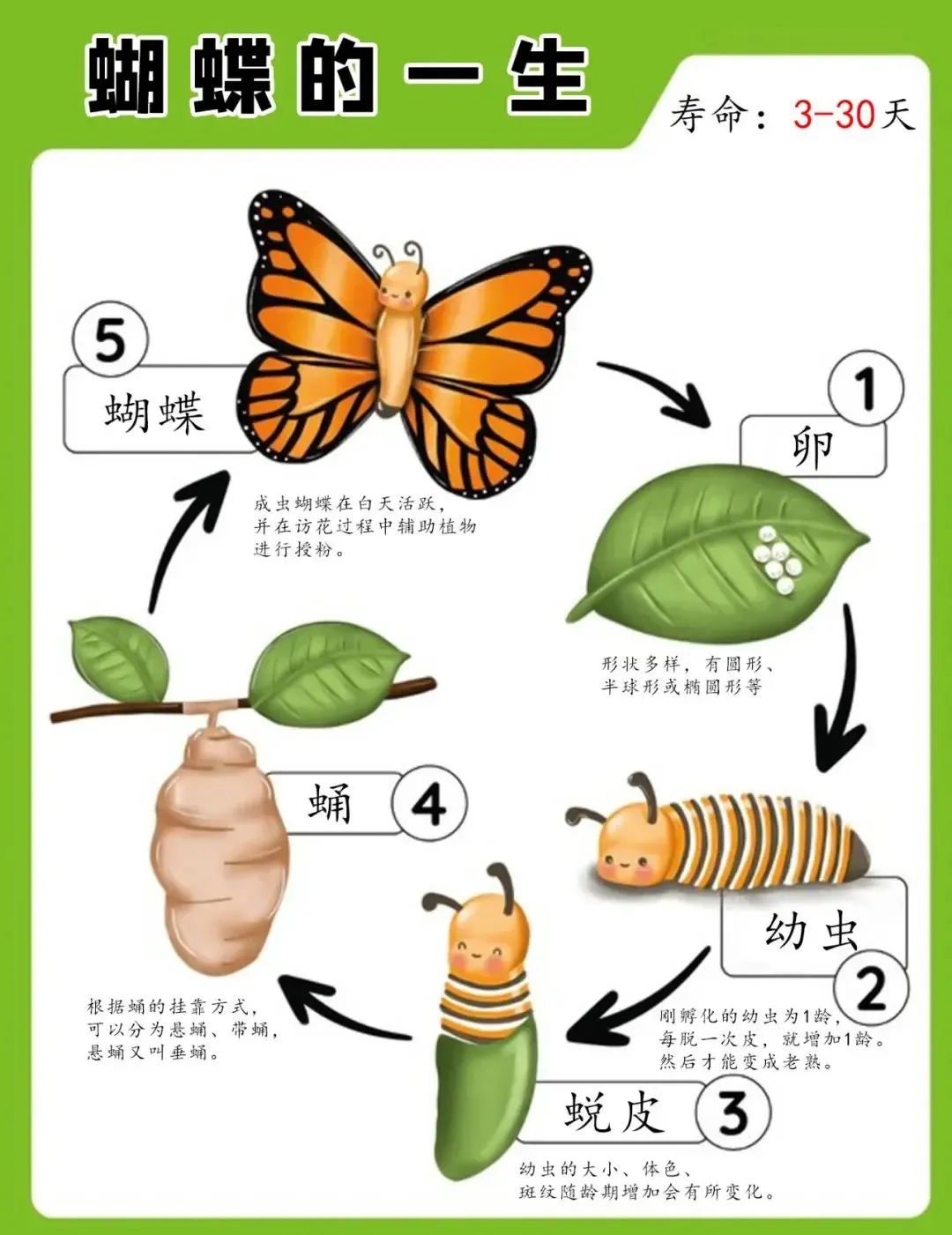 我们也会深入了解蝴蝶从卵、幼虫、蜕皮至蛹、破茧成蝶的整个生命周期
