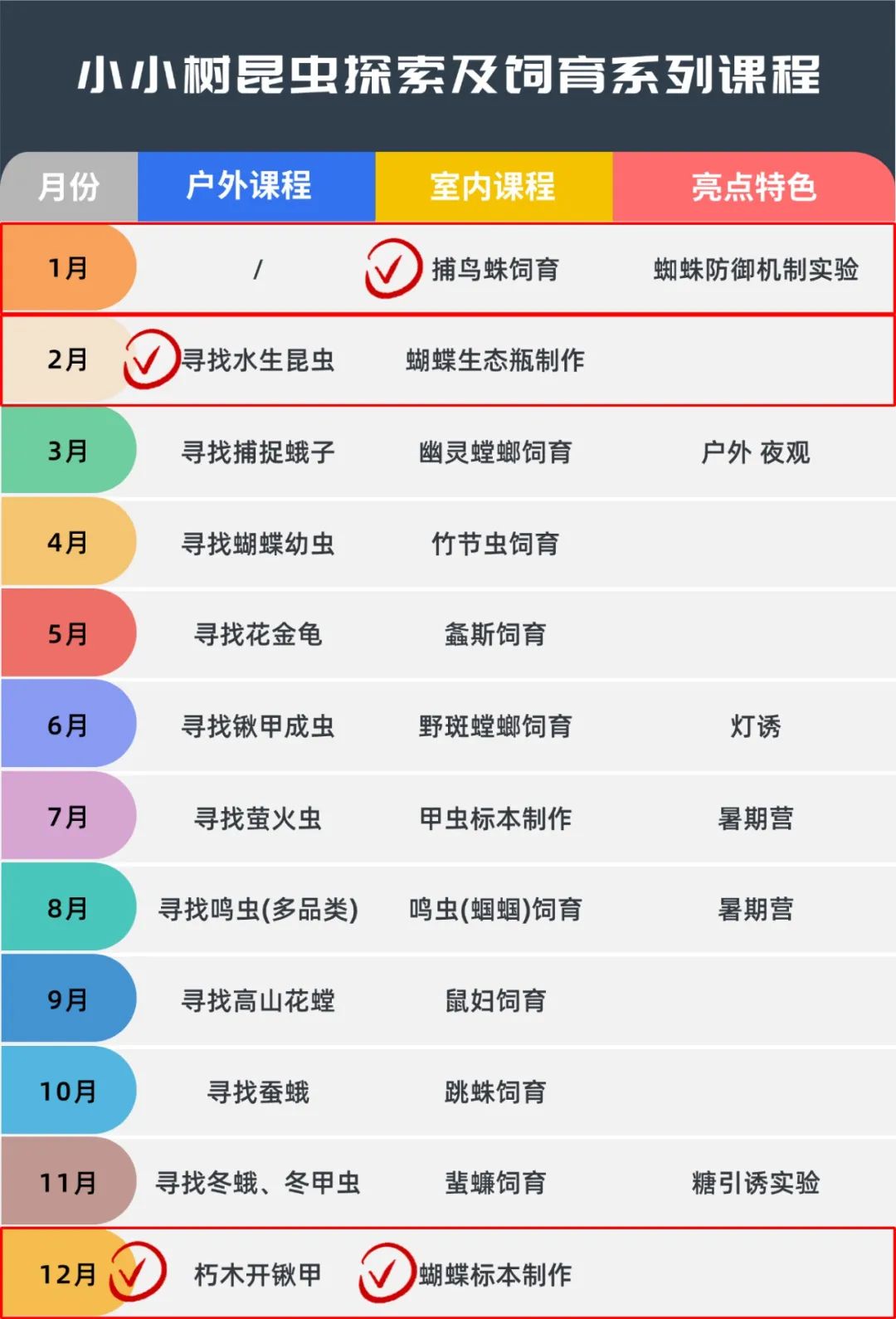 小小树博物人文开发的昆虫系列课程,将带领孩子识别、了解到熟识10+类不同昆虫的生活方法及饲育方法,从平时不曾关注的角度了解自然知识,认识神奇的昆虫世界,体验感知生命的奇迹