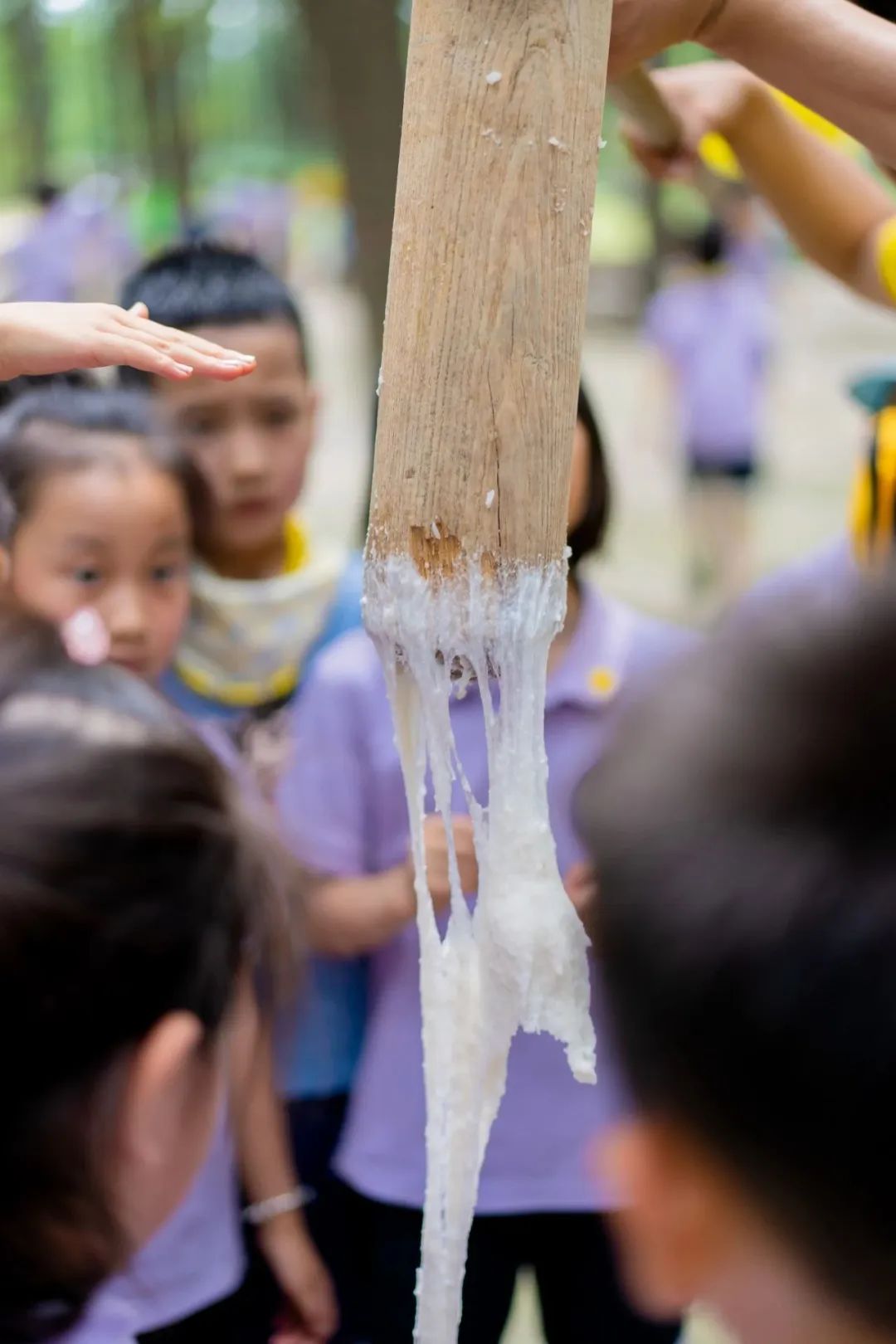 老师提前蒸好了糯米,石臼旁,孩子们一起合作,高高抬起棒槌,一下又一下,糯米在捶打下逐渐变得软糯细腻,香甜的米香已经出来了,最后裹上一点白糖来享受自己的劳动成果吧,总是自己做的更香!