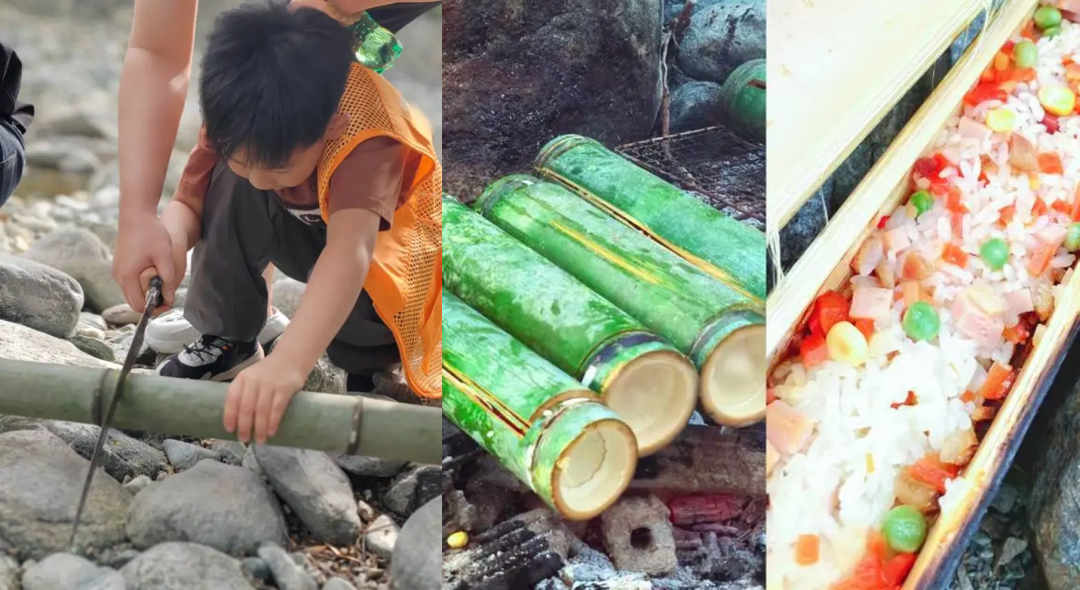 下午我们在河边自由玩水,砍竹子、做竹筒饭、团队协同制作竹筏,释放天性,在乡下做一个快乐的孩子。