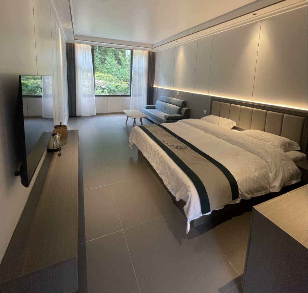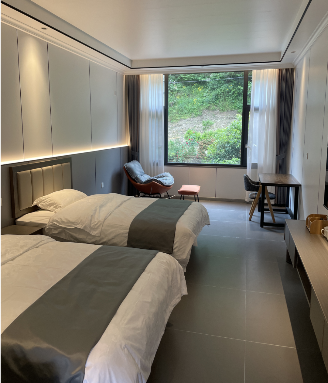 李子坝的民宿靠山靠水,文艺范儿十足,初看院落其貌不扬,可是当你推门而入,巨大的玻璃窗外满山的茶园苍翠,你一定会爱上在窗台慢慢发个呆。