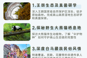 | 原始森林+生 物多样性+民族 风情+历史古建 主题丰富、内容扎实、多维度拓宽视野边界 我们将 深 入 王朗国家自然保护区 原始森林 了解高原生态系统 , 进行真菌探索 探秘 野生大熊猫栖息地 ,研究伞护物种生态链 我们将深度体验 白马藏族文化和非遗传承 在 民俗博物馆 了解白马藏族风土人文 亲手 体验 曹盖面具 的制作 我们也带着黑神话•悟空的豪情 抬头仰望 深山故宫报恩寺 ,听久远的传说 …… |