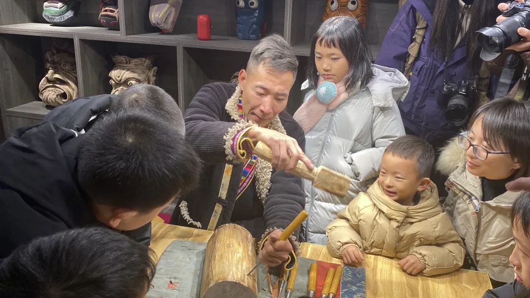 下午:抵达扒昔加非遗传承基地,吃特色午餐。非遗传承人田虎塔老师讲解曹盖的传承,以及雕刻步骤指导孩子们动手体验曹盖面具雕刻