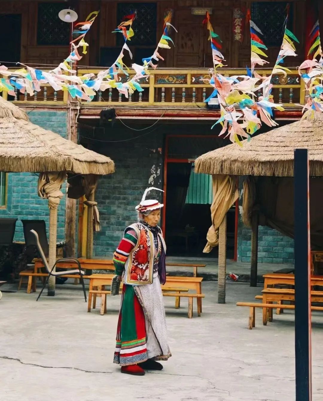 扒昔加古寨坐落于王朗自然景区天母湖畔的原始洪积带,背后是巍峨的“阿贝索热”神山,依山而建布满烟火痕迹有着上百年历史的古老木屋建筑,让扒昔加古寨充满一种穿越时空的沧桑感。