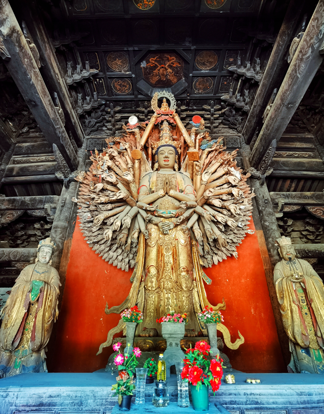 报恩寺是唯一一座纯楠木营造的寺院,院内有很多木離。干手观音,由整根木雕凿而成,身躯完工后再接出干只手臂,高约9米,头戴花冠,身后密布1004只手,手中持有宝瓶、宝珠、宝印、宝塔、玉环、杨枝等各式法器,左右环绕,宛如花盛开,做工精美,全部用纯金金帛粘贴。