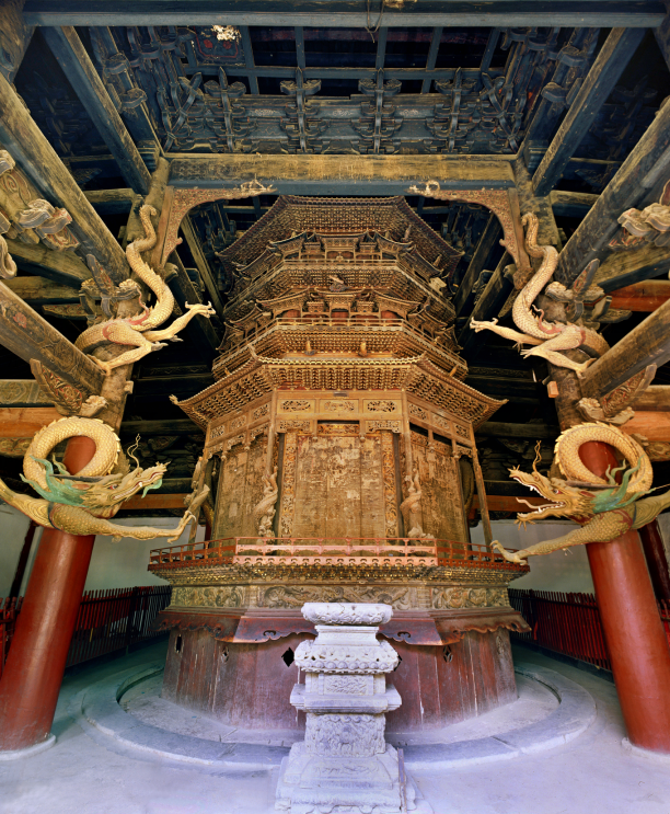 转轮经藏,也称大藏或经藏,中国寺院历来有保存经书的传统,藏经之器就是经藏。华严殿内的转轮经藏,又名“星辰车”,转动一圏,有如诵经说法一遍,专为存放经书所建,这个转轮经藏是中国现存为数不多保存完好,还能转动的转轮经藏,堪称稀世珍宝。