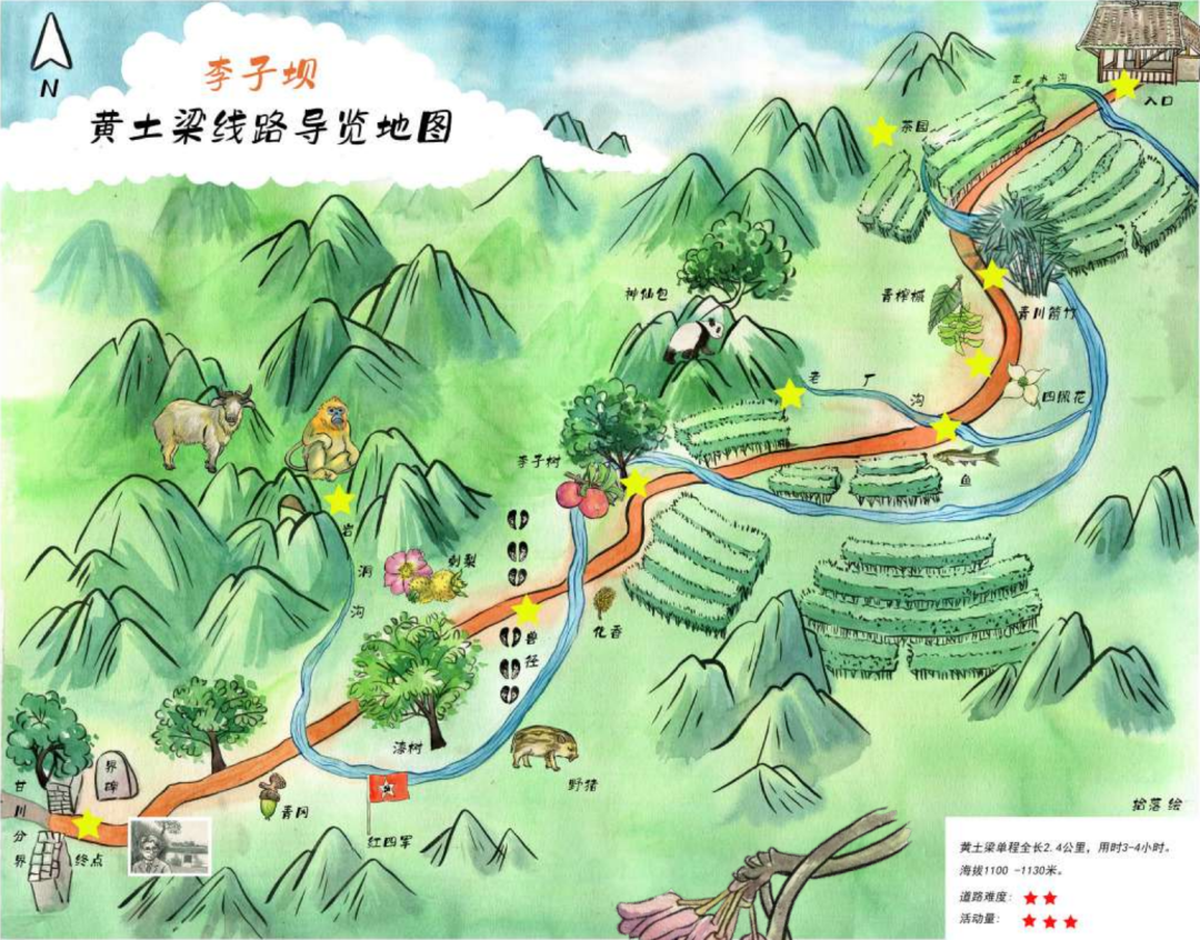 李子坝村位于摩天岭南坡,也是古阴平道穿越的地方之一,李子坝所在的碧口古镇,就是古道上重要的驿站。我们徒步的黄土梁路线,是曾经川甘之间的古商道,百年前植物猎人洛克途经这里,在曾经的关隘处留下珍贵的影像。