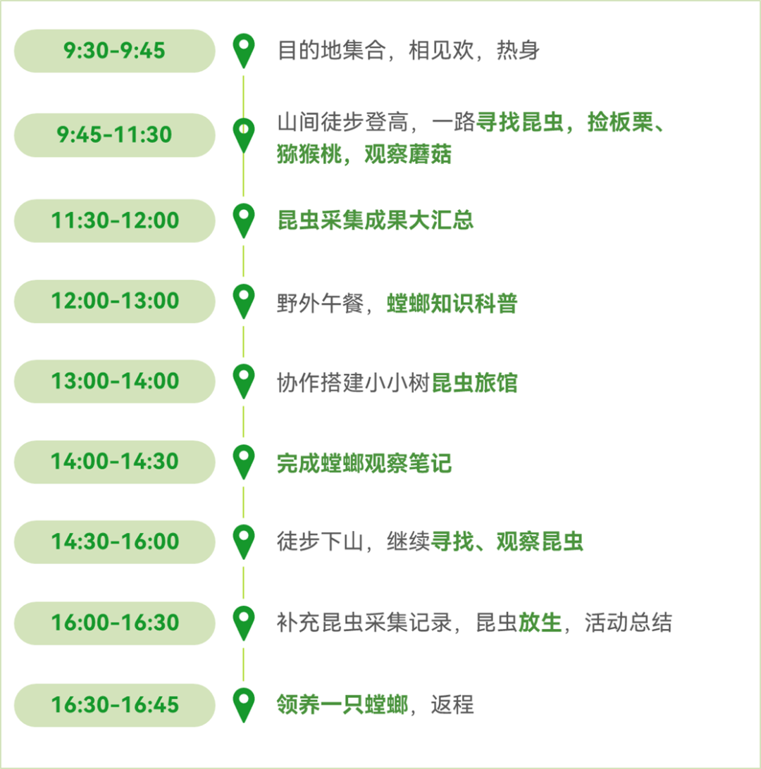 徒步之前,上林老师会讲解螳螂喜欢待在什么地方(草丛、灌木丛)。每个孩子学习像螳螂一样静止、仔细观察,寻找与环境颜色相似的昆虫,重点探寻螳螂、竹节虫等(因为大自然的不确定性,寻找的目标昆虫会有变化)。