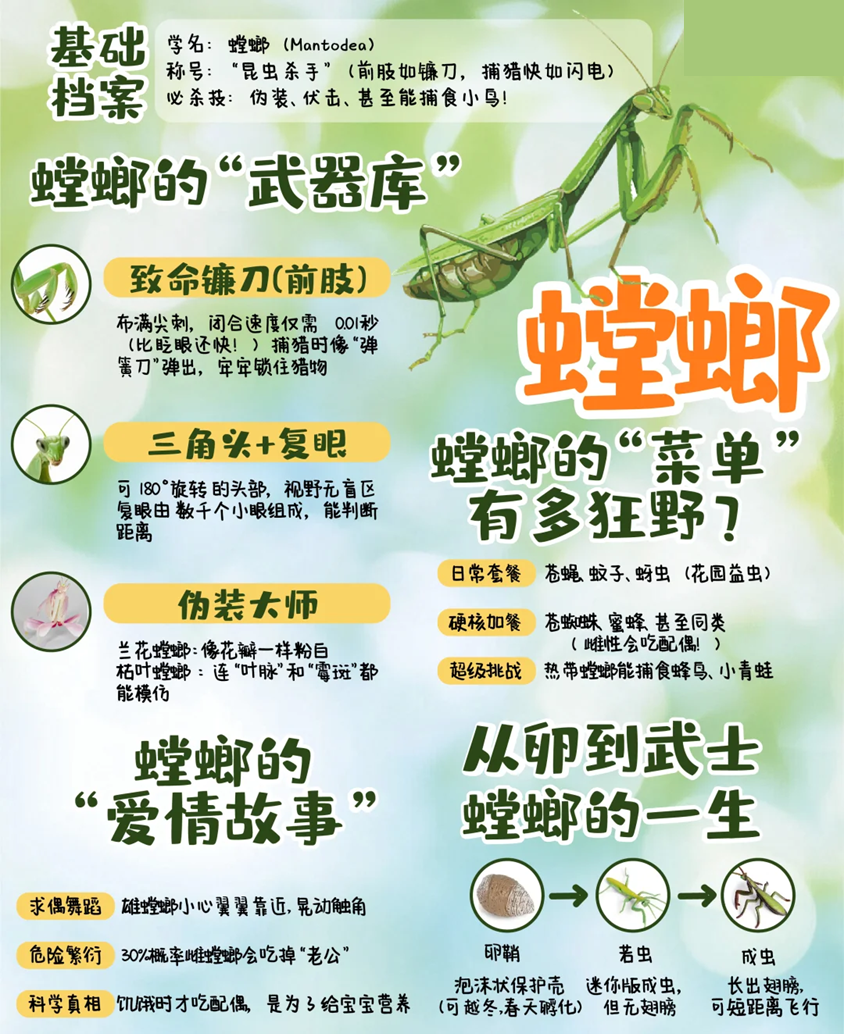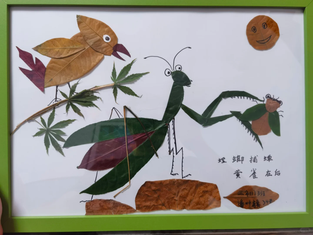 我们就地取材,利用捡来的落叶、树枝、泥土等,在卡纸上拼贴出一只螳螂。在作品旁写下或画下今天的发现,记录我们当下的真实感受,螳螂的了解更加深入了~