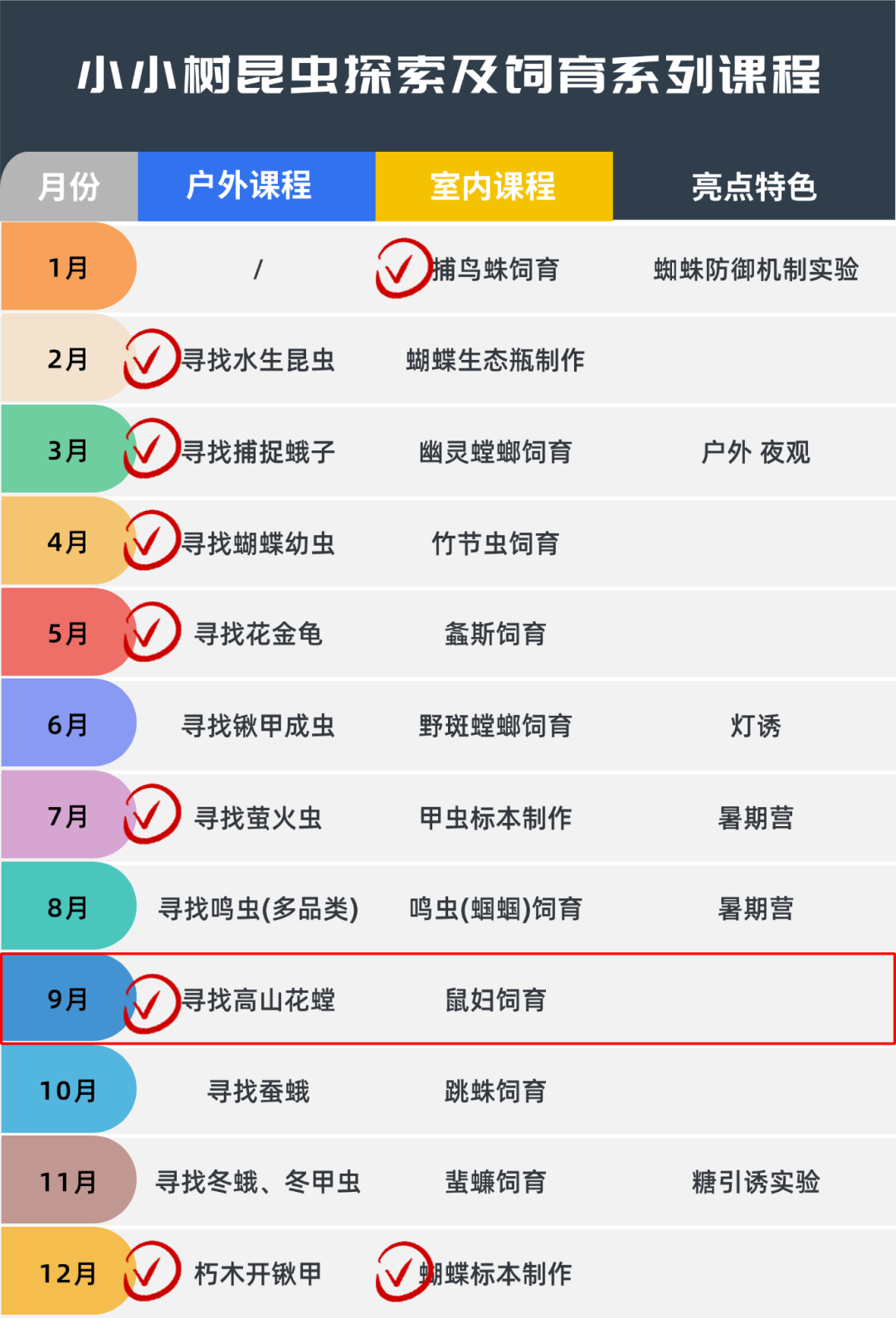 小小树博物人文开发的昆虫系列课程,将带领孩子识别、了解到熟识10+类不同昆虫的生活方法及饲育方法,从平时不曾关注的角度了解自然知识,认识神奇的昆虫世界,体验感知生命的奇迹。